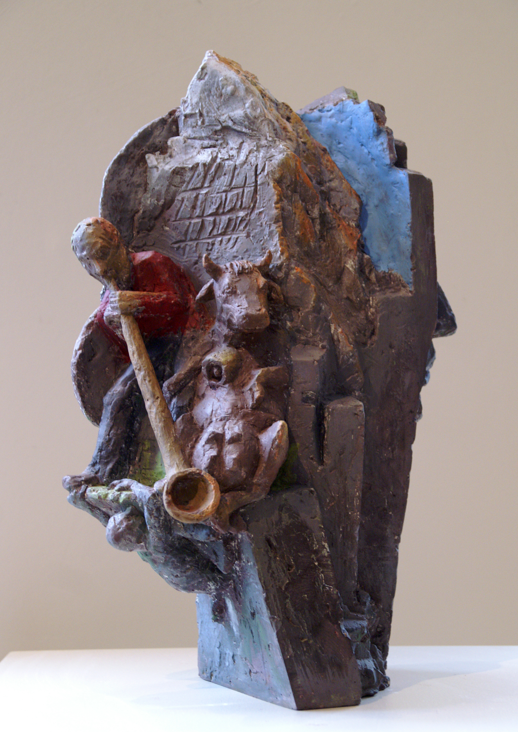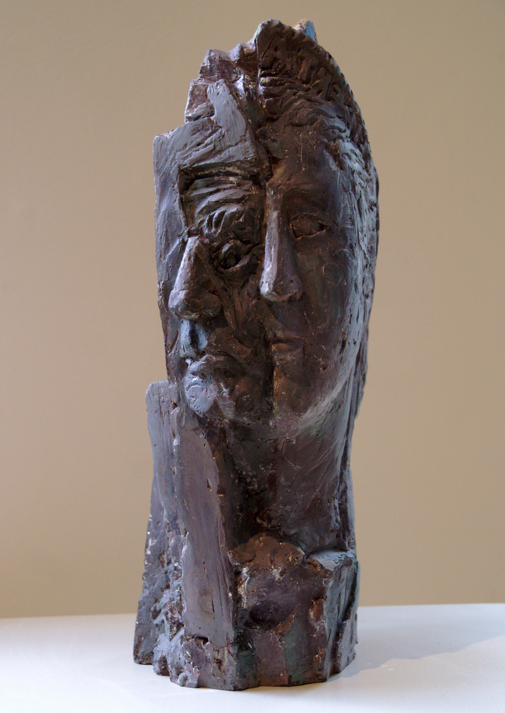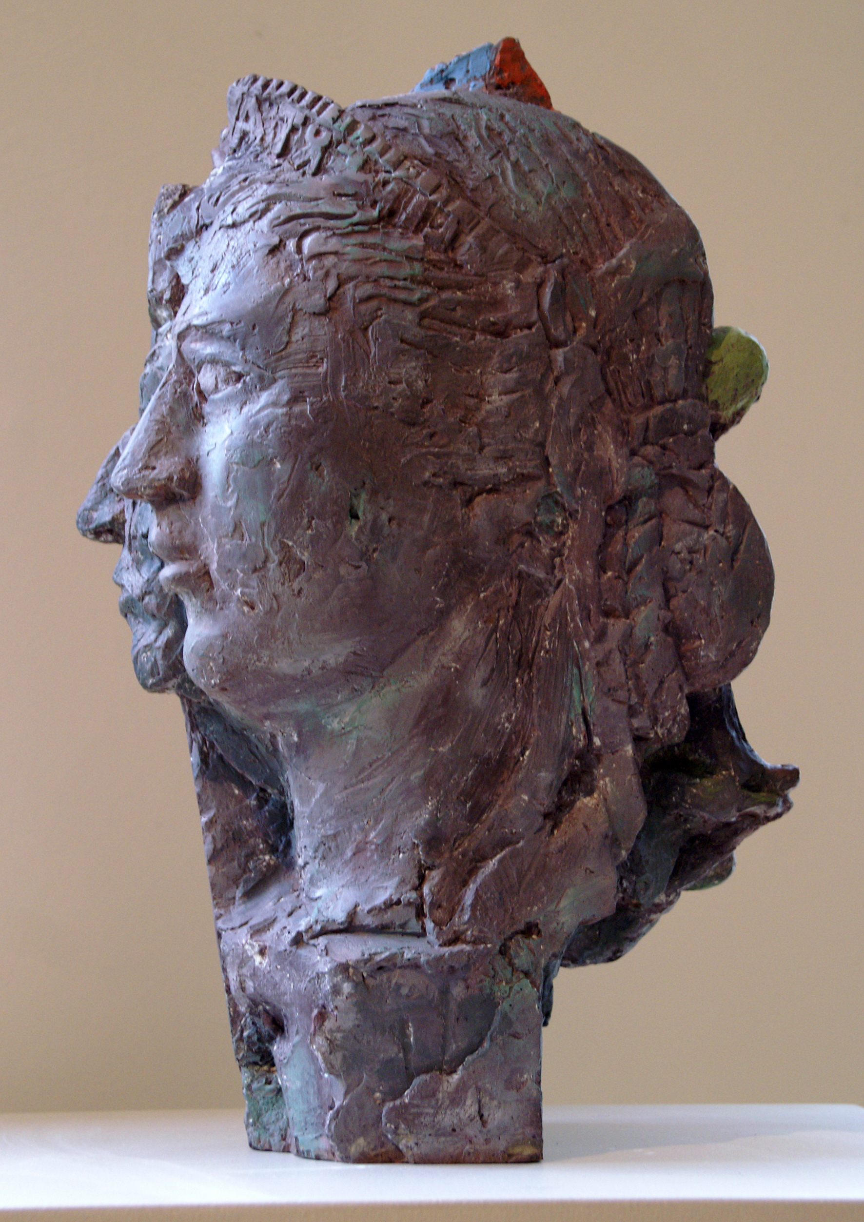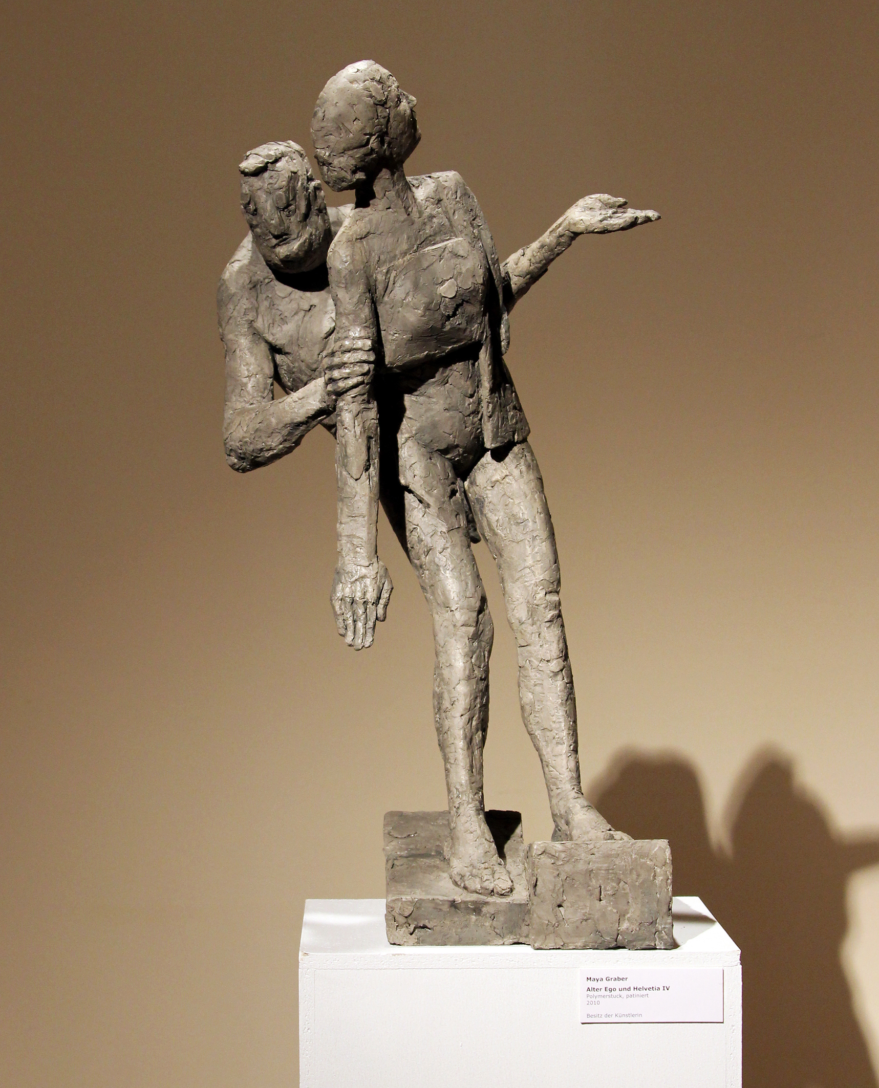 Mit „Alter Ego und Helvetia lV“ ist diese Reihe fürs erste abgeschlossen. Die Doppelfigur thematisiert einen Widerspruch der Schweiz: Das Wunschbild der neutralen, unbeteiligten, schönen Helvetia steht wie ein starres Schutzschild vor ihrem Alten Ego, der sich halb versteckt. Er scheint ein Hanswurst zu sein- zurückgeblieben vor dem Fortschritt, schwerfällig und vollgefressen. Diese Arbeit kommt ohne Attribute aus.