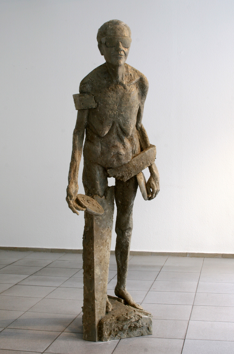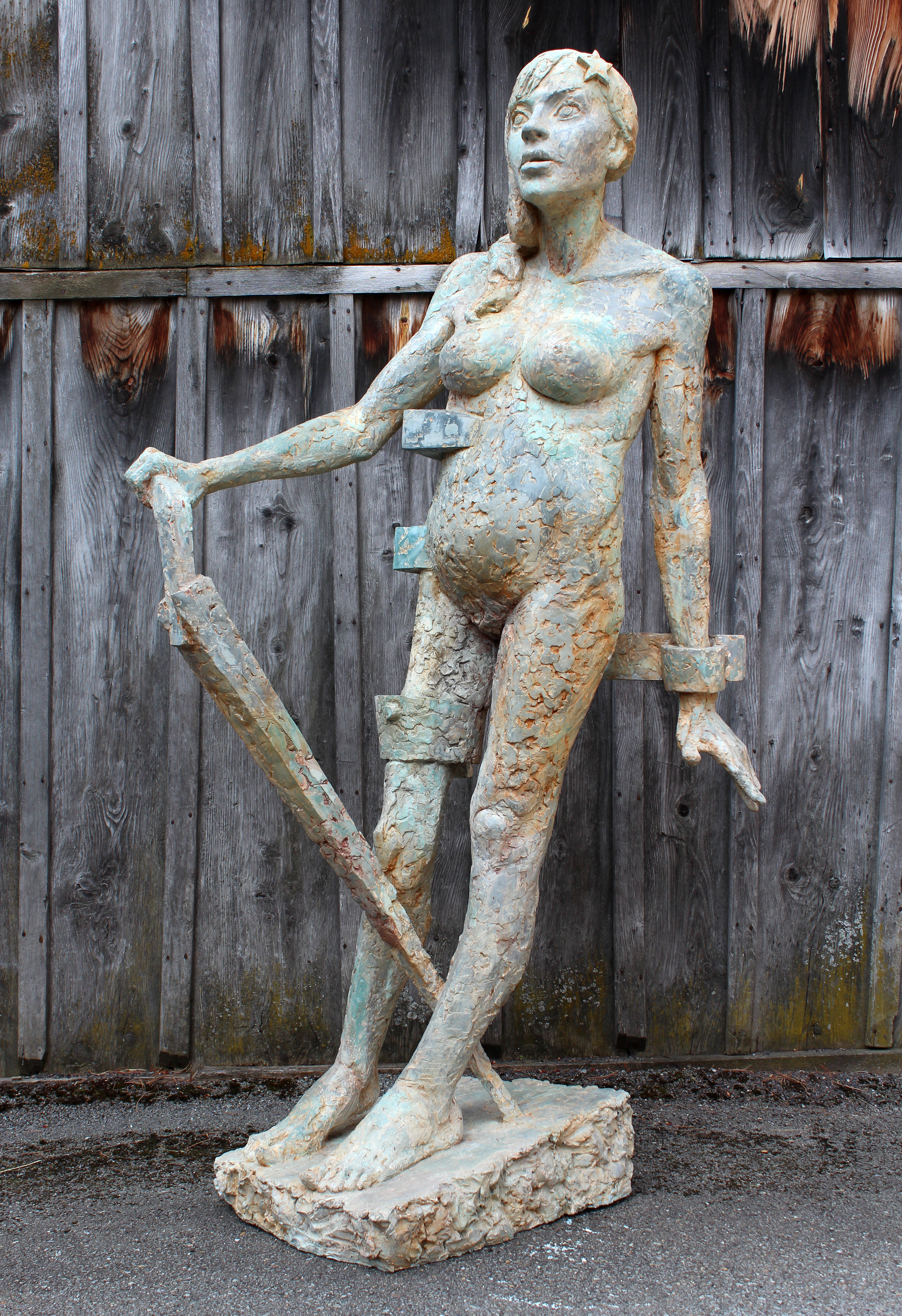 Die jüngste Arbeit in der Reihe der Allegorien ist eine „Europa“. Wiederum eine aus der Bahn geratene, schiefe Figur. Diese Europa ist eine junge Frau, das Gesicht maskenhaft (weil schon mehreren Schönheitsoperationen unterworfen). Der ist Körper ist stellenweise ausgezehrt, frühzeitig gealtert. Krampfhaft hält sie einen Stock, doch es ist ungewiss, ob ihr dieser Halt bietet- ist er doch selber aus dem Ruder geraten. Gestützt wird sie durch eine Art Korsett – Zeugnis vieler Reparaturarbeiten.